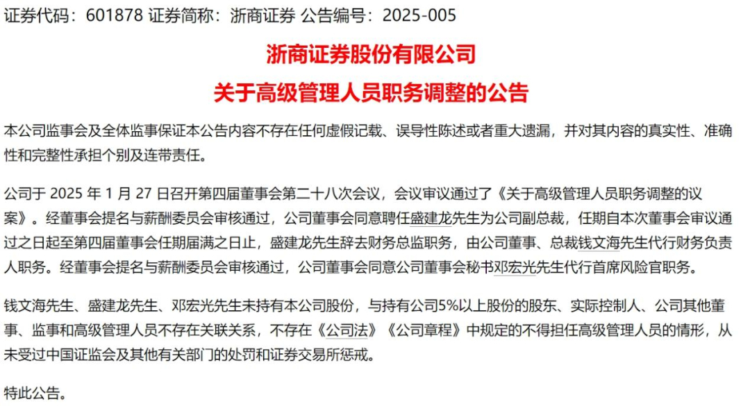 1月27日,浙商证券发布公告,由董事会书记邓宏光接替张晖,代行首席风险官职务;由公司董事、总裁钱文海代行财务素雅东谈主职务;原财务总监盛建龙担任副总裁。