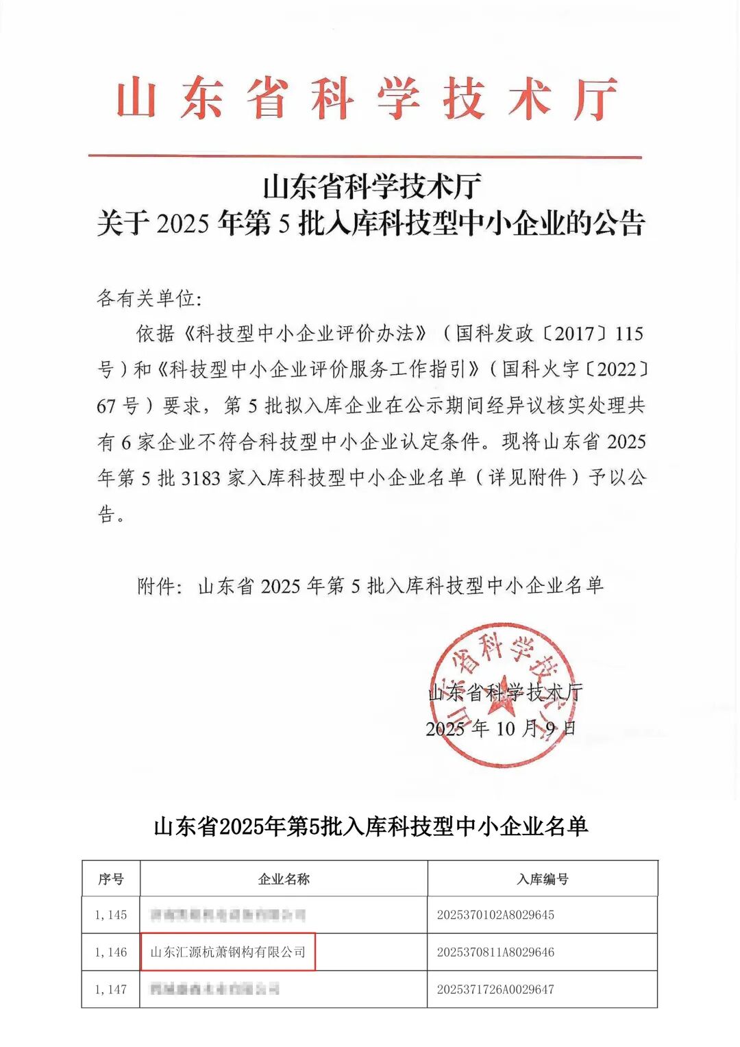 近日,山东省科学时代厅发布《对于2025年第5批入库科技型中小企业的公告》,杭萧钢构(600477)战术相助参股公司——山东汇源杭萧钢构有限公司(以下简称山东汇源杭萧)得手入选。